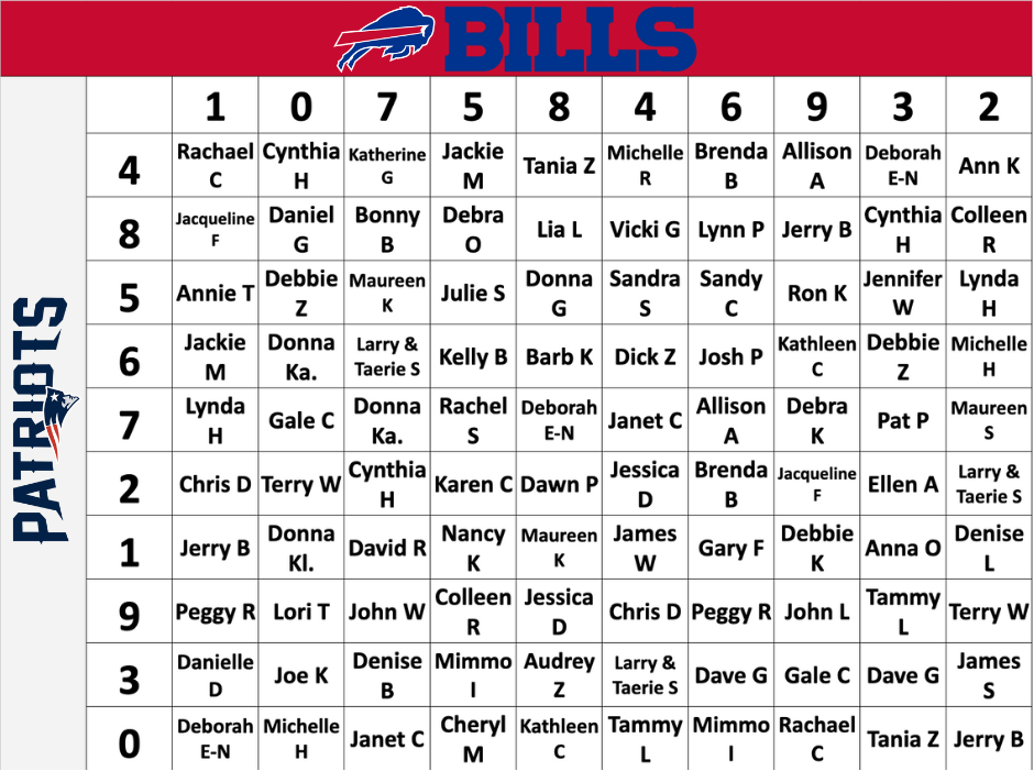 This fundraising Game Square is for the Buffalo Bills vs. New England Patriots game, Sunday, October 5. Squares are $20 each.