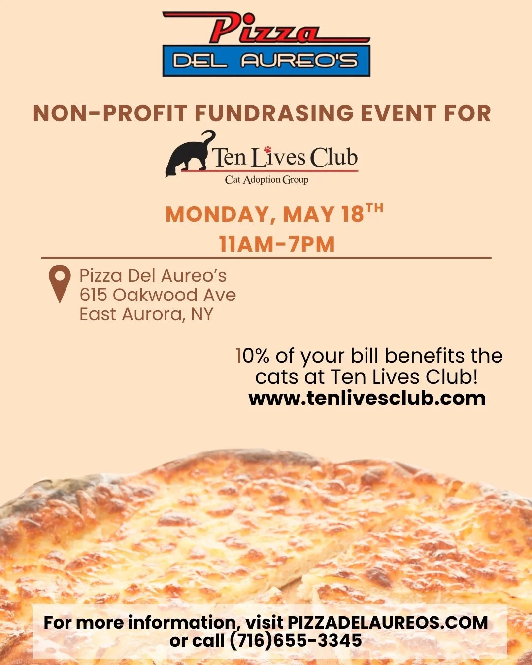 Join us at Pizza Del Aureo’s on Monday, May 18th from 11AM–7PM and treat yourself while giving back! 💛